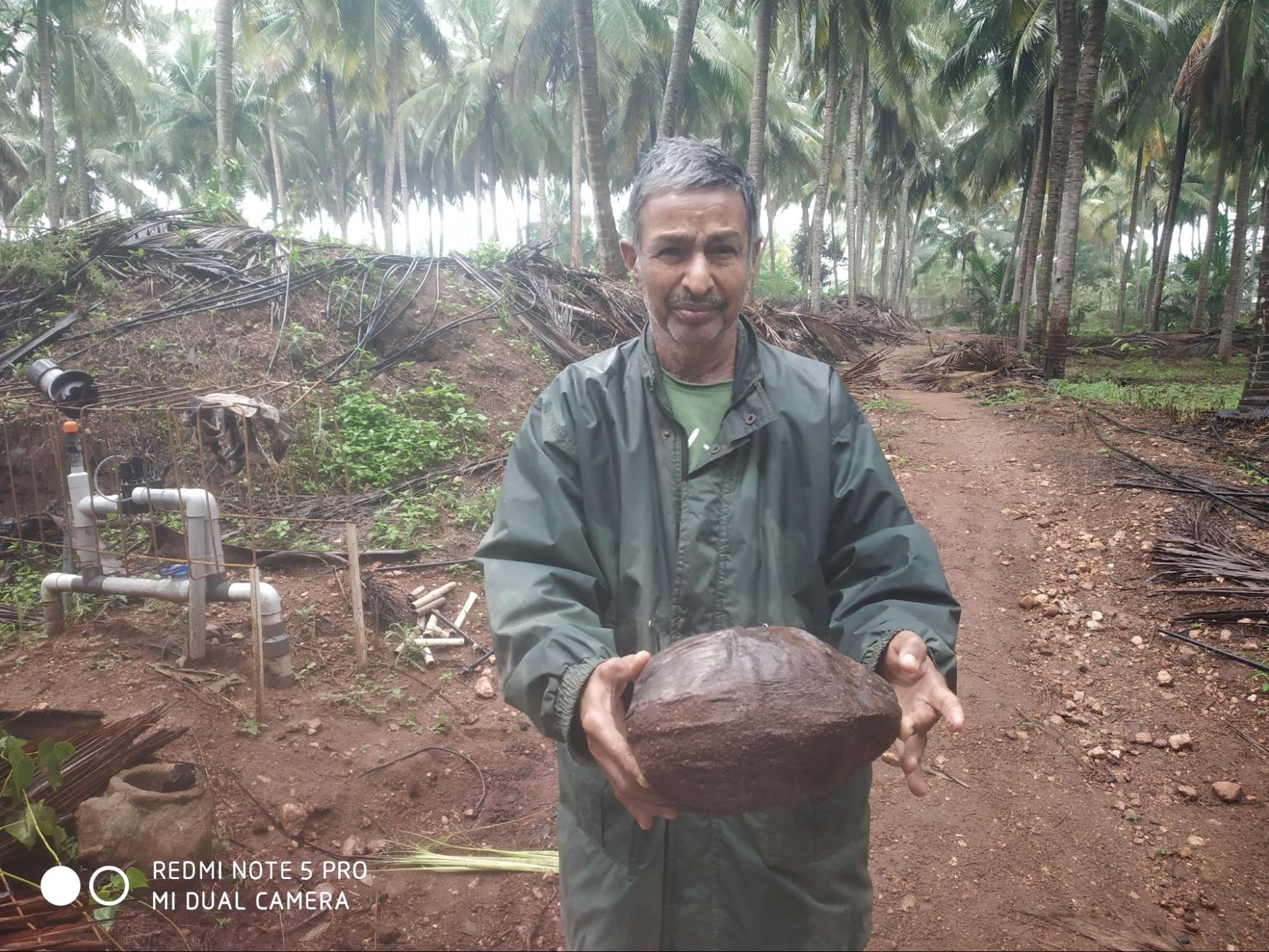 On his 6.5-acre farm, lovingly named Kuppusamy Gounder Thottam, Mr. Chennimalai follows organic practices to grow coconut, areca nut, nutmeg, and bananas. His philosophy is rooted in working with nature, not against it.